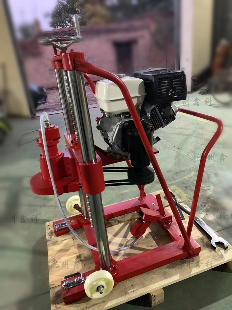 5、開孔:以上作業(yè)做好后,即可開孔作業(yè),裝上鉆頭,起動(dòng)汽油機(jī)(詳情見汽油機(jī)用戶手冊)把進(jìn)水管放入水桶內(nèi),水桶要提到高出水泵位置,然后手捏氣襄把水吸入水泵,水泵上水后把水桶放在地面即可。油門調(diào)至z大,開始輕搖給進(jìn)手柄,使鉆頭緩慢接觸地面。開孔要訣:先給水后鉆進(jìn),給進(jìn)速度要慢,鉆壓要小。嚴(yán)禁無水作業(yè),以免燒壞鉆頭和水封。