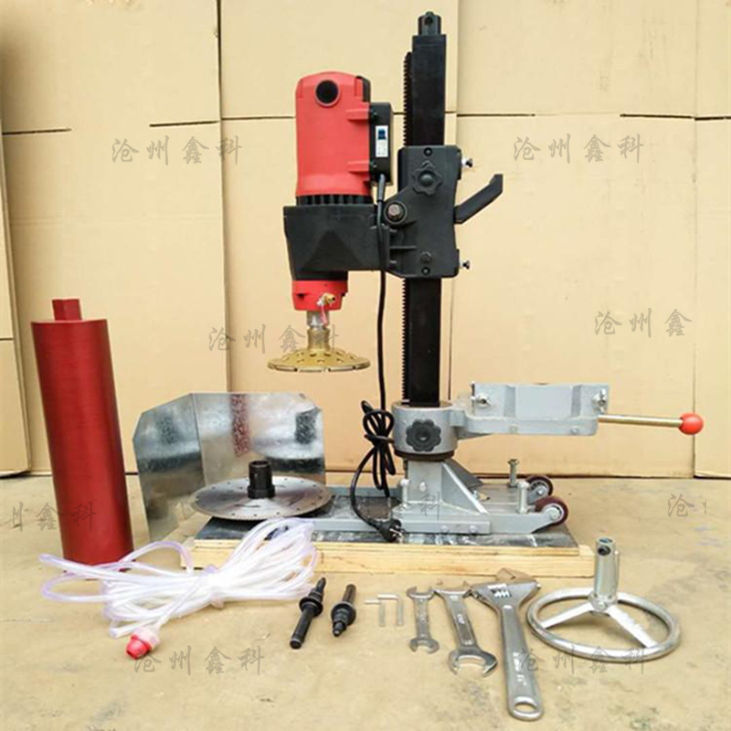 4、安裝:鉆頭對(duì)孔位后,把三個(gè)行走輪搬起,讓底座落到地面。打小孔且混凝土強(qiáng)度不高時(shí),則依靠鉆機(jī)的自身重量就可將鉆機(jī)固定,若打的孔徑較大,鉆機(jī)自身重量不能穩(wěn)住鉆機(jī)時(shí),可在底盤上放置重物(如砂袋、鐵塊、混凝土塊等)固定或打兩個(gè)膨脹螺栓加上壓桿(如槽鋼等)來固定鉆機(jī),鉆機(jī)固定要牢靠,不得搖晃,否則鉆孔作業(yè)無法正常進(jìn)行。