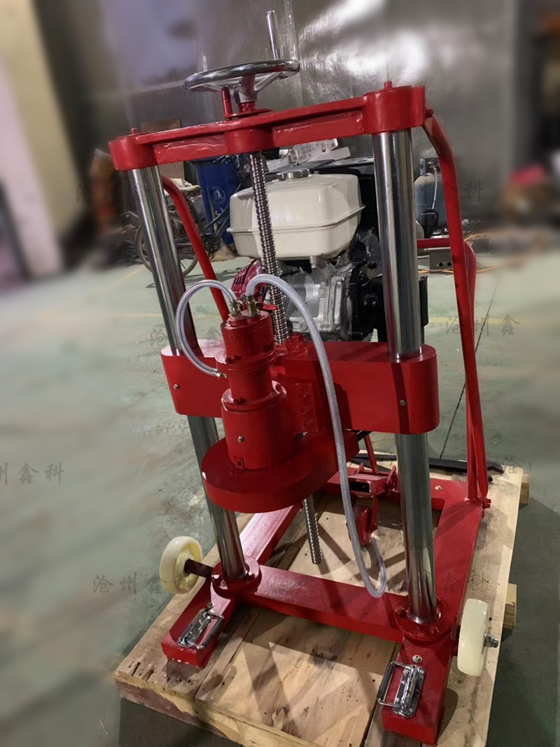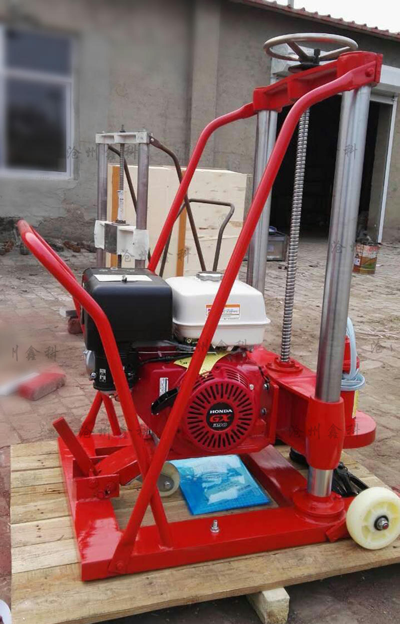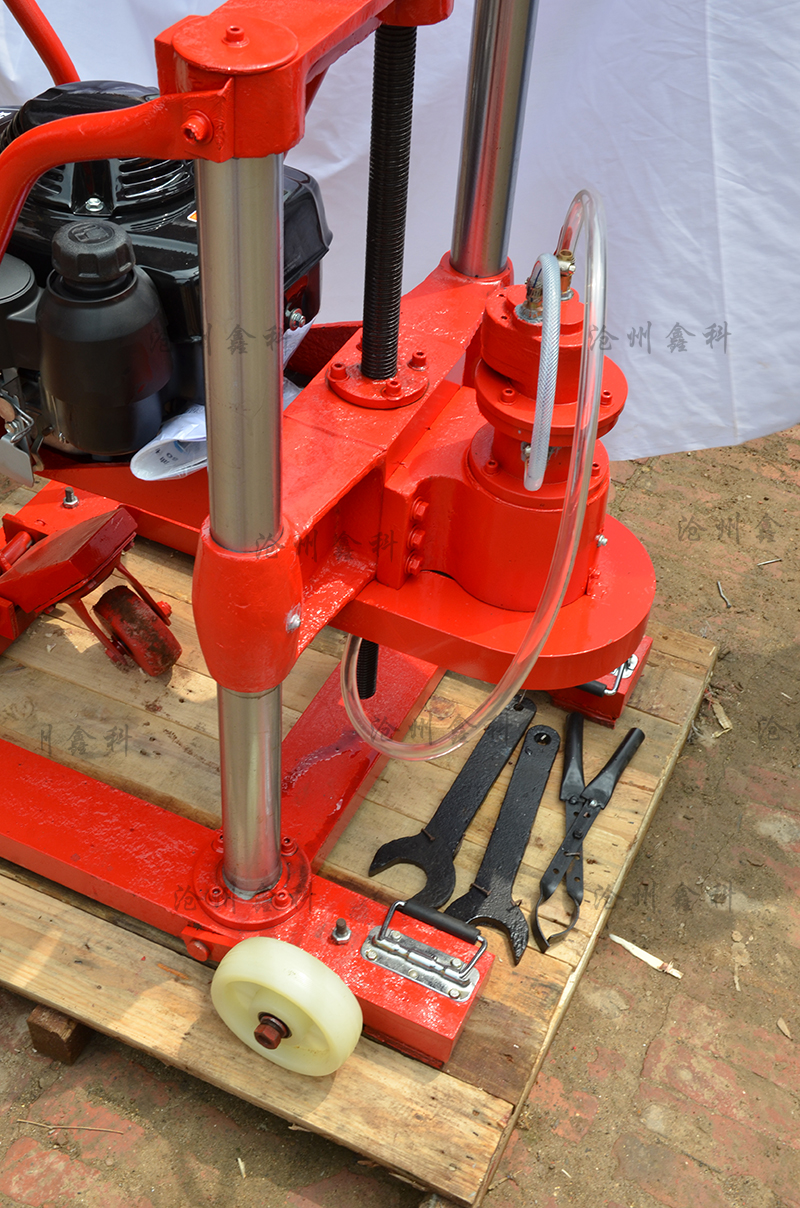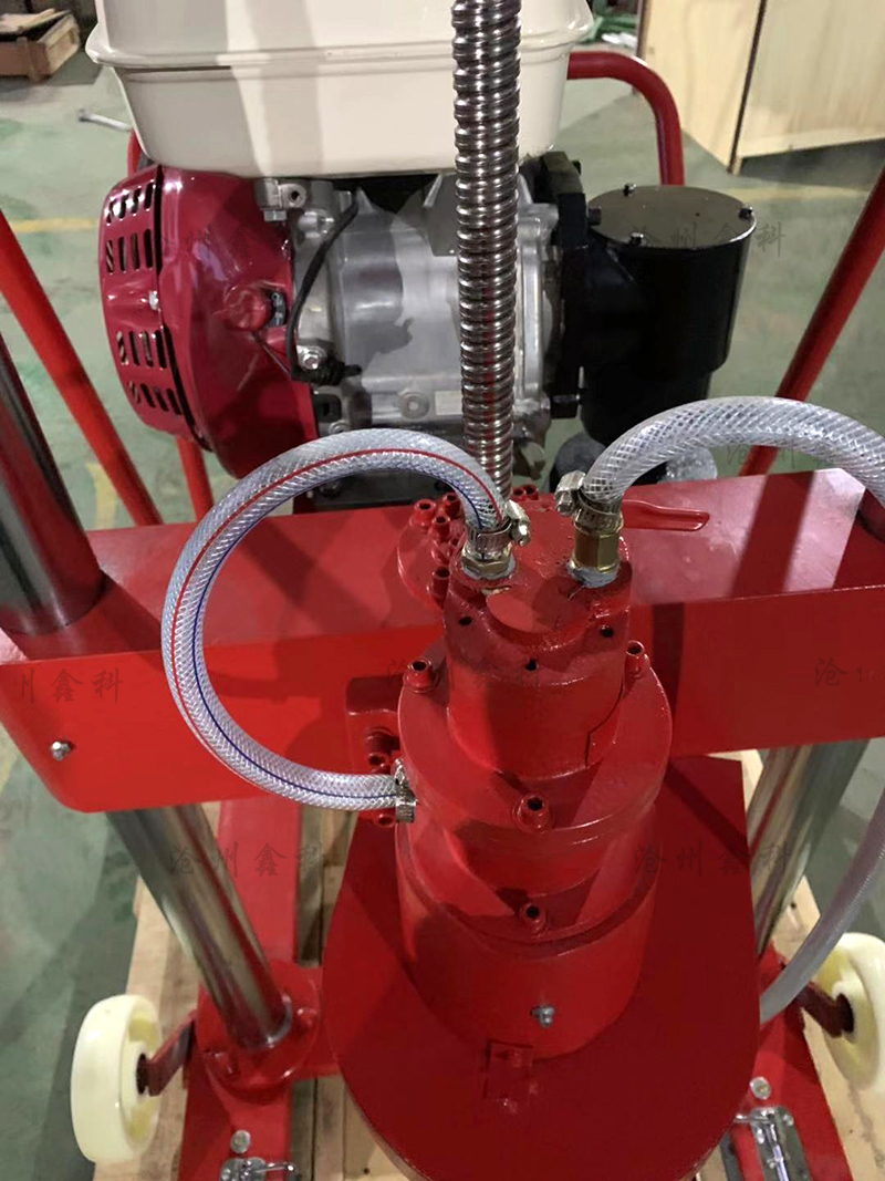 5、開孔:以上作業(yè)做好后,即可開孔作業(yè),裝上鉆頭,起動(dòng)汽油機(jī)(詳情見汽油機(jī)用戶手冊)把進(jìn)水管放入水桶內(nèi),水桶要提到高出水泵位置,然后手捏氣襄把水吸入水泵,水泵上水后把水桶放在地面即可。油門調(diào)至z大,開始輕搖給進(jìn)手柄,使鉆頭緩慢接觸地面。開孔要訣:先給水后鉆進(jìn),給進(jìn)速度要慢,鉆壓要小。嚴(yán)禁無水作業(yè),以免燒壞鉆頭和水封。