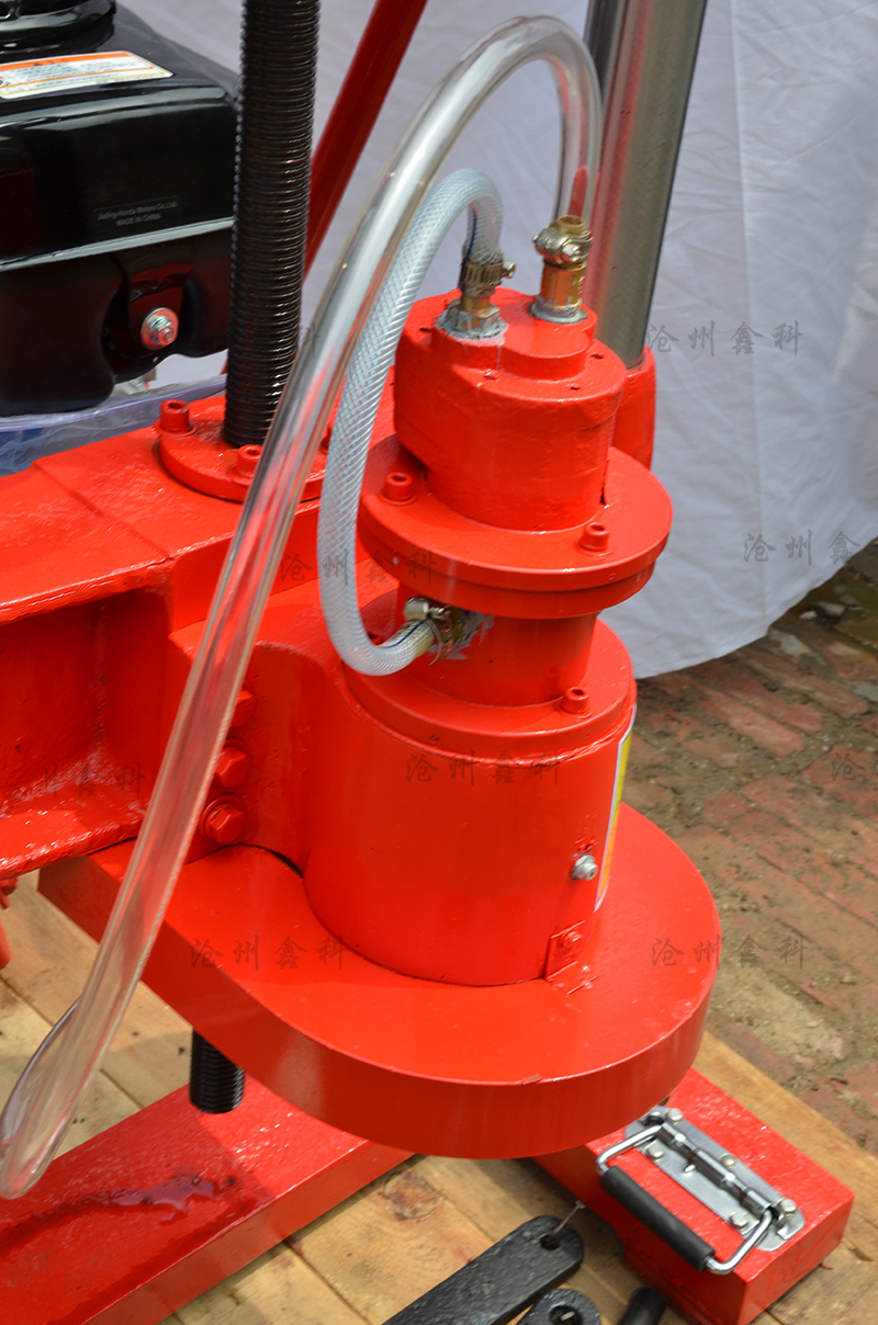 5、開孔:以上作業(yè)做好后,即可開孔作業(yè),裝上鉆頭,起動(dòng)汽油機(jī)(詳情見汽油機(jī)用戶手冊(cè))把進(jìn)水管放入水桶內(nèi),水桶要提到高出水泵位置,然后手捏氣襄把水吸入水泵,水泵上水后把水桶放在地面即可。油門調(diào)至最大,開始輕搖給進(jìn)手柄,使鉆頭緩慢接觸地面。開孔要訣:先給水后鉆進(jìn),給進(jìn)速度要慢,鉆壓要小。嚴(yán)禁無水作業(yè),以免燒壞鉆頭和水封。