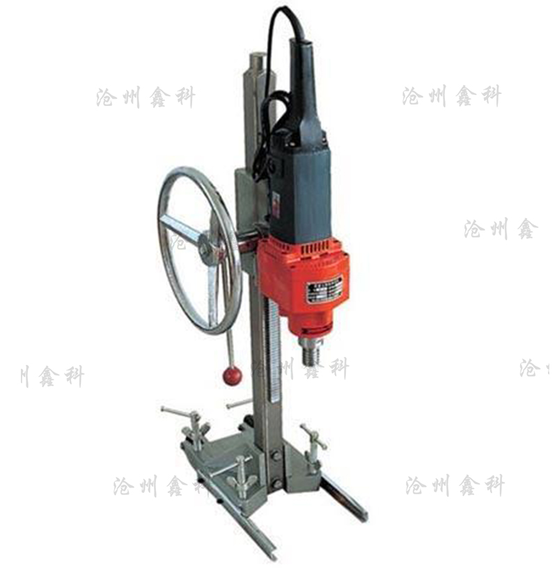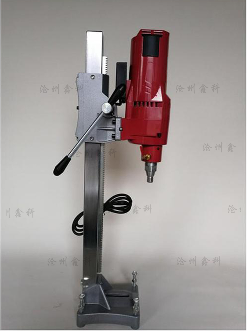 4、安裝:鉆頭對(duì)孔位后,把三個(gè)行走輪搬起,讓底座落到地面。打小孔且混凝土強(qiáng)度不高時(shí),則依靠鉆機(jī)的自身重量就可將鉆機(jī)固定,若打的孔徑較大,鉆機(jī)自身重量不能穩(wěn)住鉆機(jī)時(shí),可在底盤上放置重物(如砂袋、鐵塊、混凝土塊等)固定或打兩個(gè)膨脹螺栓加上壓桿(如槽鋼等)來固定鉆機(jī),鉆機(jī)固定要牢靠,不得搖晃,否則鉆孔作業(yè)無法正常進(jìn)行。
